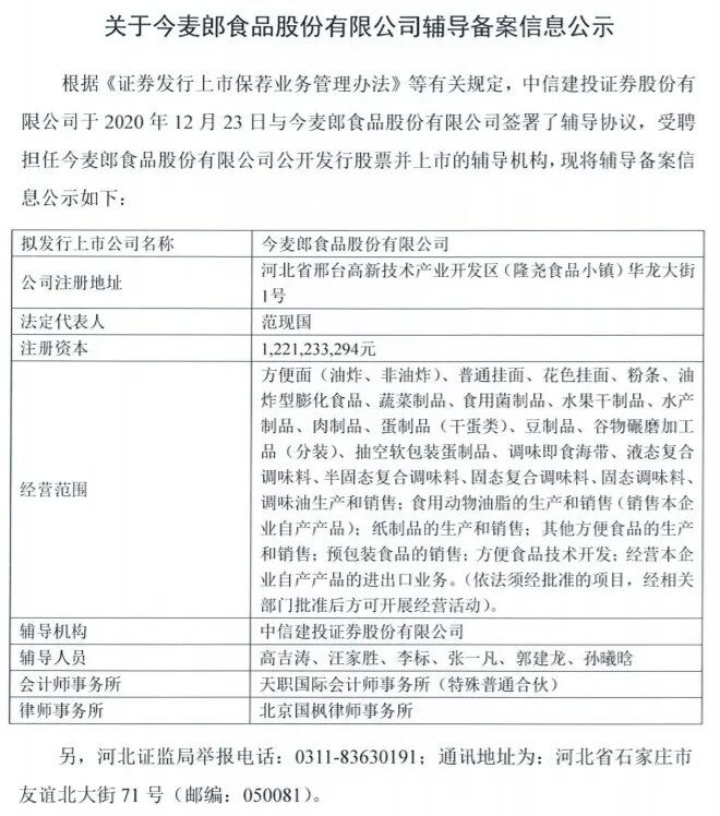 据河北证监局最新消息,今麦郎食品股份有限公司已与中信建投证券签署上市辅导协议,受聘担任今麦郎食品股份有限公司公开发行股票并上市的辅导机构。