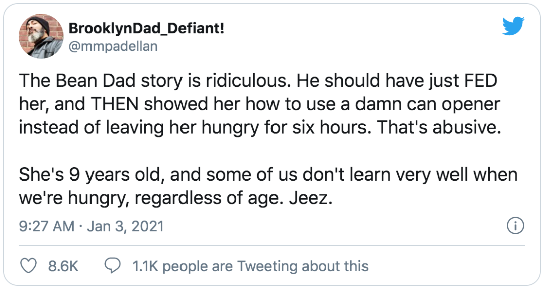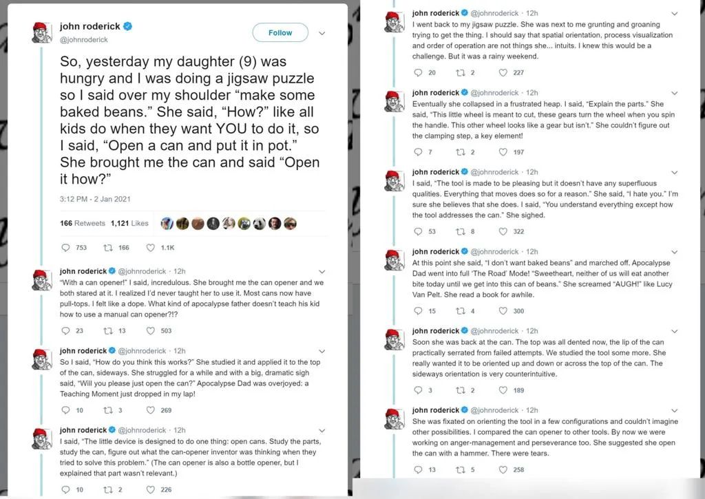 美国的一名音乐人John Roderick在推特上沾沾自喜的炫耀自己的育儿案例,就是扔给九岁的女儿一盒豆子罐头和一个开罐器,没有明确告知孩子该怎样去做,反而威胁你打不开罐子就没得吃哦,然后自己就去玩拼图去了,结果孩子用了六小时徒劳无果,饿的哇哇大哭。他显然骄傲于自己的管教方式,还把这称为teachable moment。可是,除了那句威胁的话语,他教孩子什么了?就一句模棱两可的话,工具嘛没别的用途,自有其存在的原因?