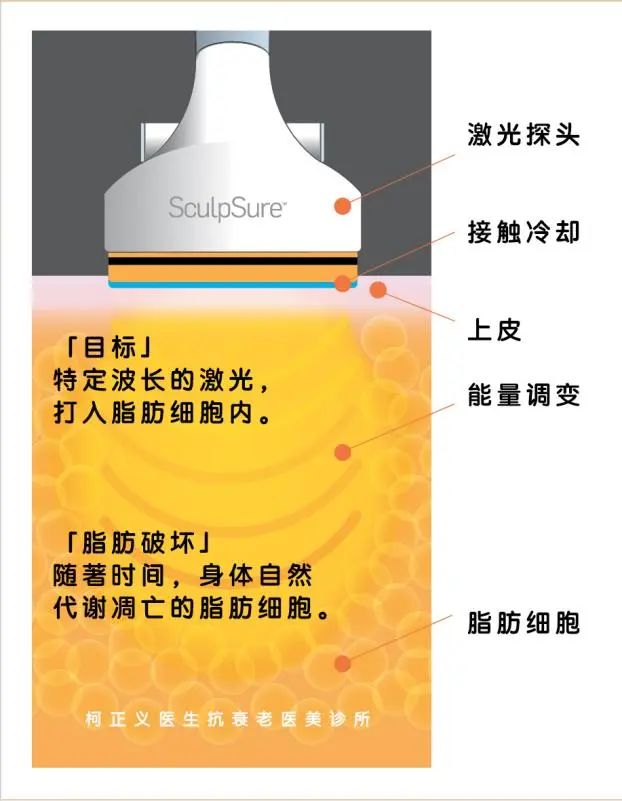 SculpSure是全球第一台获FDA认证的非侵入性体外激光溶脂仪器。它使用1060nm波长,可作用深达3cm的皮下脂肪,以非侵入的方式透过真皮进入皮下脂肪,并将皮下脂肪层加热至摄氏42至47度,破坏脂肪细胞,而不伤害到周围组织。脂肪细胞随后会被人体代谢掉,1-3个月后脂肪细胞数量就可以明显减少。一个疗程只需25分钟,就可以轻松击碎脂肪。它是所有溶脂技术中非侵入性、最不费力的瘦身疗程。疗程过程会有温热感,术后不会有淤青,可以立刻恢复正常活动。