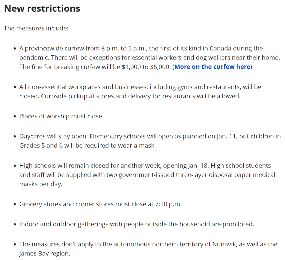1.魁北克省全境从1月9日(周六)起,每天晚8点到5点实施宵禁。除部分豁免人员外(下文会讲到),宵禁期间擅自出门者一律罚款1000至6000加元。