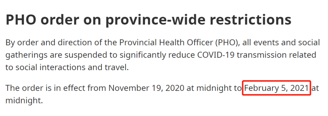 此外,BC省目前施行的封城禁令原定将于1月8日到期,但Henry博士在7日的新闻发布会上表示,目前BC省采取的所有防疫措施,包括社交聚会禁令,均被延长28天,目前这一系列的禁令到期时间暂定为2021年2月5日。