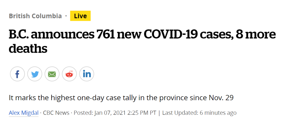 温哥华时间1月7日下午3时,BC省首席卫生官Bonnie Henry博士宣布,在过去的24小时,BC省新增761例新冠病例。这是自12月13日以来最高的新增记录。