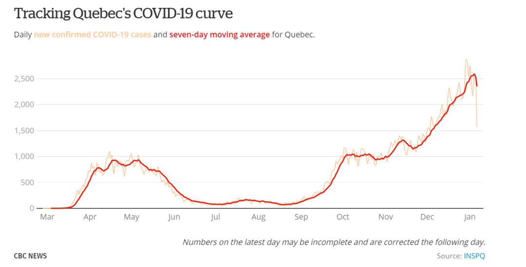 在宣布新规后的第二天,当地时间1月7日,魁北克省全境新增2519例新冠感染者,比该省当前的周平均新增数据(2554)略低一点。此外,魁北克省7日新增死亡74人,目前该省尚未治愈的活跃病例达24,955例。