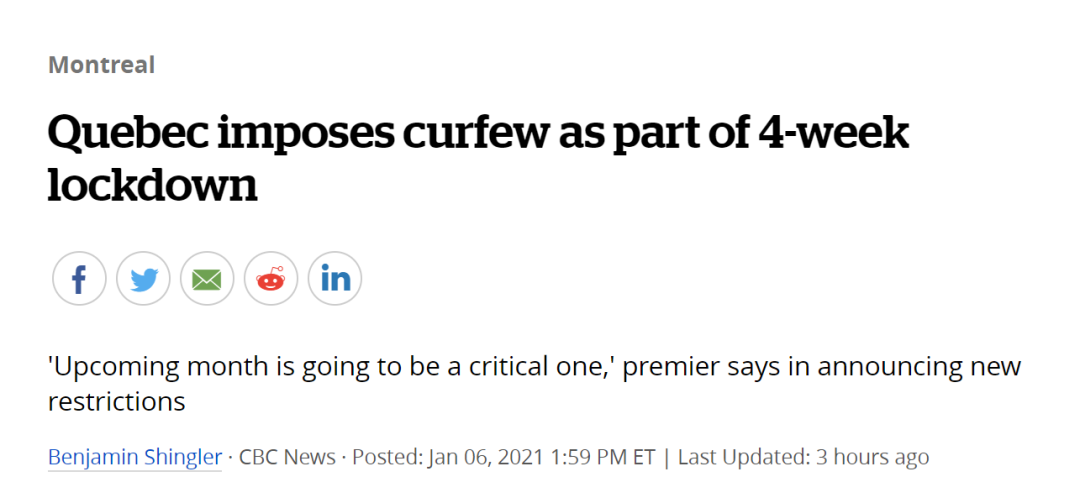 魁北克省政府1月6日宣布了该省、乃至加拿大新冠抗疫史上最严的封城措施。除了将现有的封锁政策延长一个月,魁省省长Francois Legault称,该省自1月9日开始实行宵禁。宵禁及大部分封城措施的截止日期暂定为2月8日。
