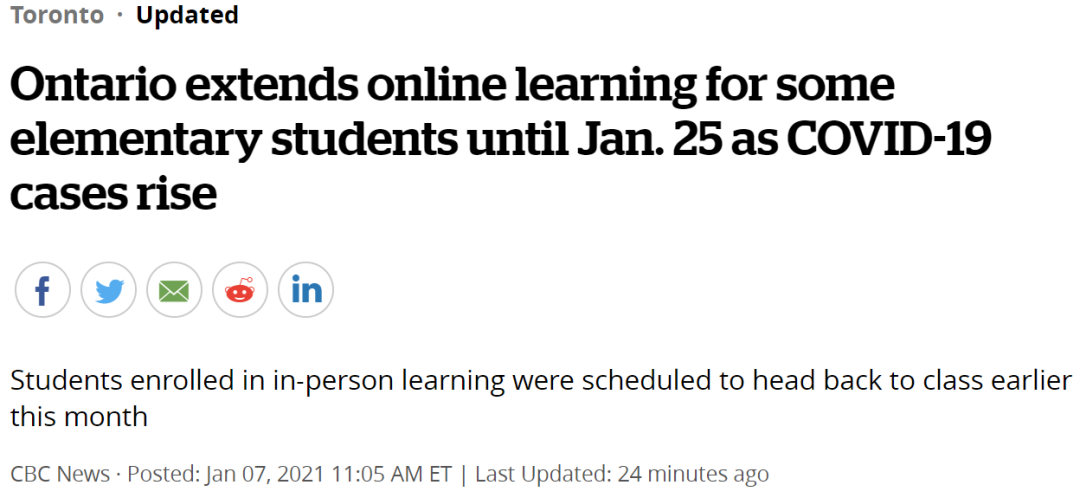据CBC报道,1月25日同时也是安省所有高中生返校的日子,但开学还是1月11日——也就是说,1月11日开学后,安大略省大部分中小学生都会先在家里上两个星期的网课,然后1月25号之后按规定同意返校。