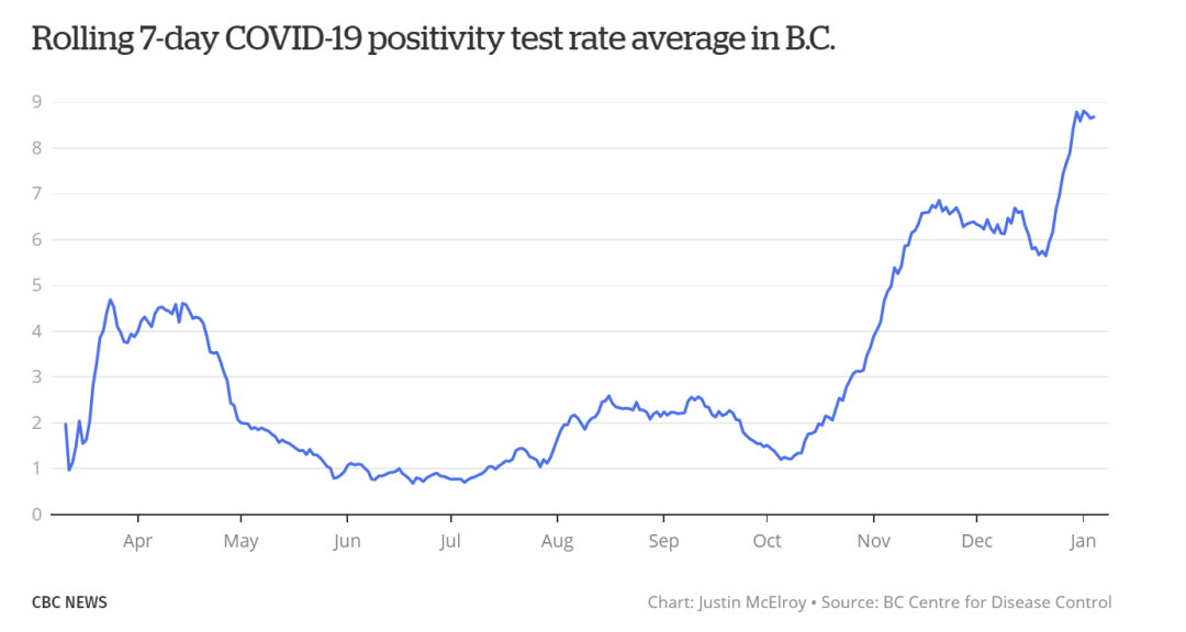 据CBC 1月7日报道,11月下旬到12月初期,BC省的平均新冠检测量大约是每天12,000人次。但自12月20日以来,BC省的平均新冠日检测量仅有6500人次——检测量下降了45%,可BC省日新增仅下跌13%。对此,CBC解释称,但更大幅度的检测量下降可能预示着本省的平均新冠阳性率已经升至历史最高水平。