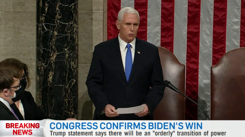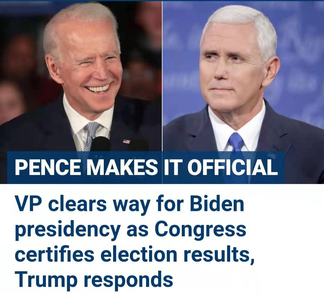 暴乱被控制之后,美国国会继续被迫中断的会议。1月7日凌晨3点40分,美国副总统彭斯正式宣布,民主党候选人乔·拜登赢得大选,当选第46任美国总统。与此同时,特朗普表示,同意“有序”(orderly)交接权力。