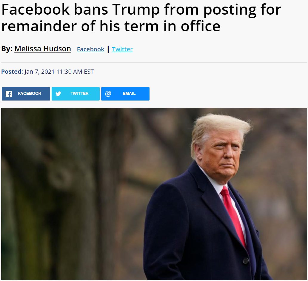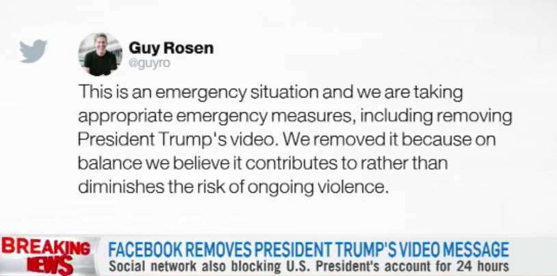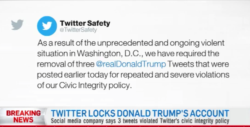 昨天,推特和脸书平台称特朗普发布的内容违反公民诚信(Civic Integrity)政策,决定将特朗普账号发出的文字和视频删除,并封号,12-24小时。
