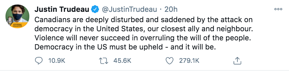 特朗普发推文要求示威者“支持国会大厦警察和执法”。推文中写道:“他们确实站在我们国家的一边。保持和平!”