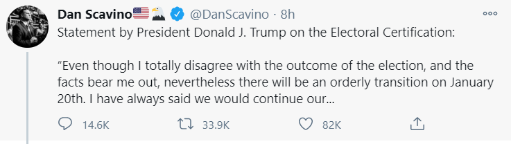 特朗普在一份声明中表示:“尽管我完全不同意大选的结果,事实也证明了我的观点,但1月20日的政权交接将有序进行。”