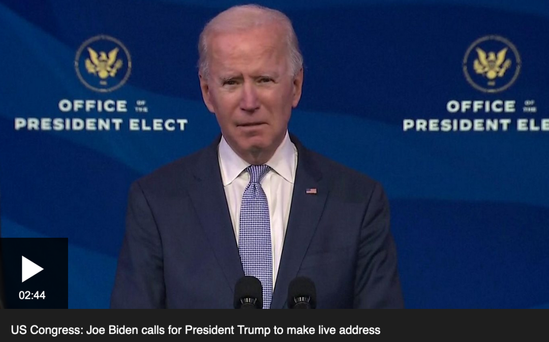 拜登在特拉华州威尔明顿(Wilmington, Delaware)的家中,呼吁支持特朗普的“暴徒”收手,“让民主向前推进。”