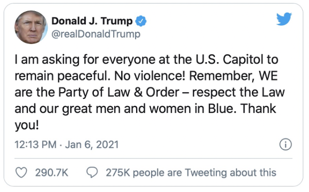 特朗普再发推文,向美国国会大厦的抗议者表示:“我请求在国会山的每个人保持和平,拒绝暴力!记住,我们是拥护法律和秩序的党派,尊重法律和我们伟大的身穿制服的男性和女性。谢谢大家!”