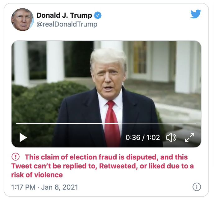 推特刚刚宣布,由于特朗普今天早些时候发布了有关选举的推文,他的账户将在未来12小时内被封禁。(今早Facebook宣布关闭特朗普页面直至他任期结束。)