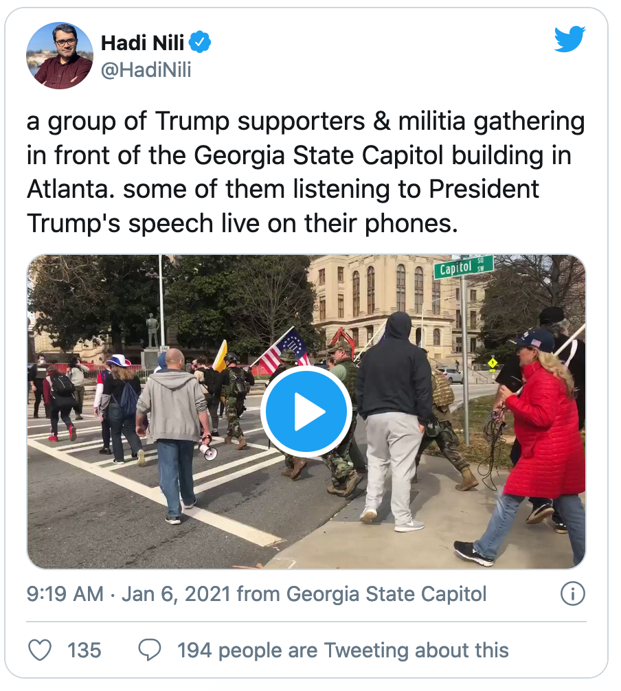 佐治亚州(Georgia)武装抗议者携带武器游行至亚特兰大国会大厦,抗议选举结果并表达对特朗普的支持。