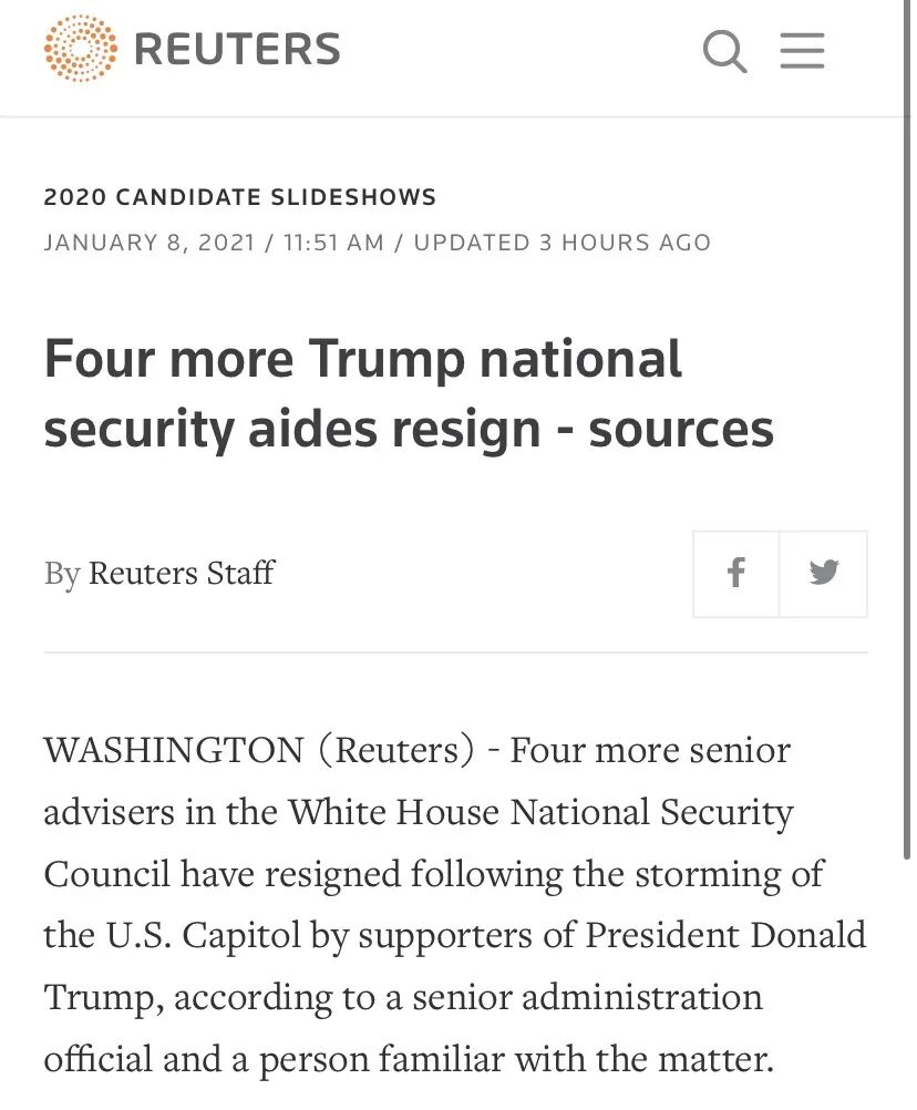 路透社8日消息,据一名政府高级官员和一位知情人士透露,在美国国会暴乱事件发生后,美国国家安全委员会又有四名高级顾问辞职。