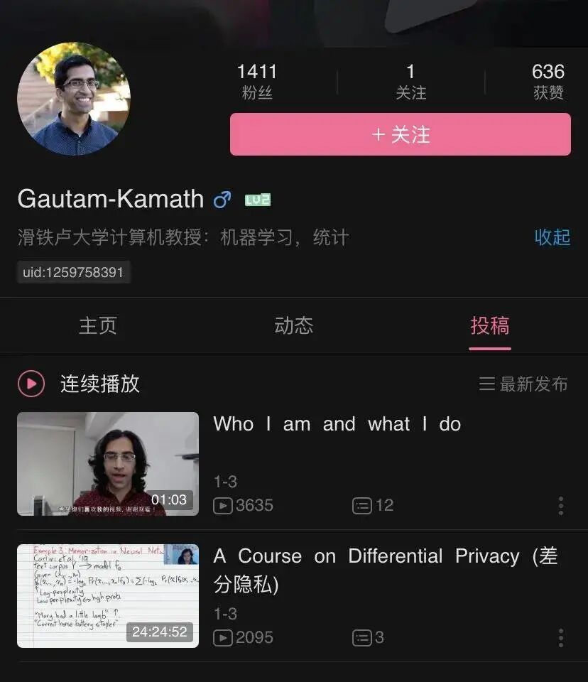 其中引人关注的当然是他上传的第一门课程《A Course on Differential Privacy (差分隐私)》,总时长高达 24.5 个小时,上传两天便引来不少账号点赞。