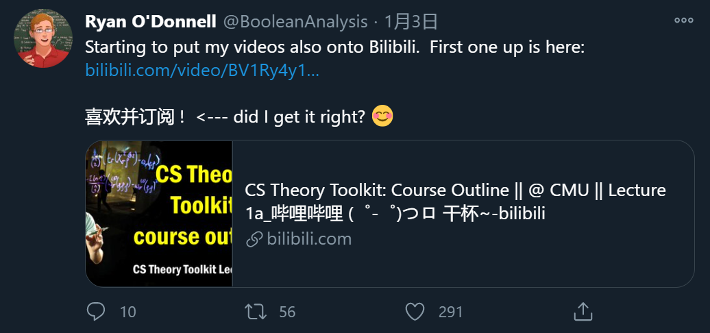 Kamath 表示自己入驻哔哩哔哩的想法是受到了卡耐基梅隆大学(CMU)计算机科学教授 Ryan O”Donnell 启发。在 1 月 3 日,O”Donnell 教授也上传了自己的第一个 B 站视频计算机理论工具包。