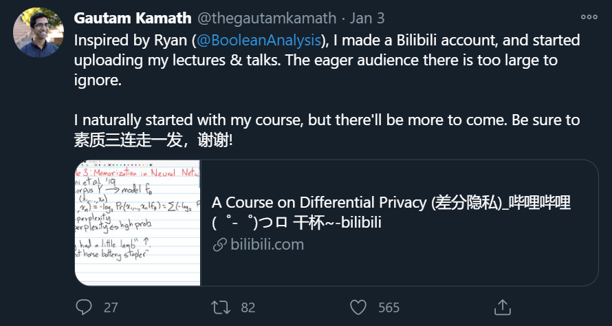 【加拿大乐活网lahoo.ca 亚瑟综述】2021年1 月 3 日,加拿大滑铁卢大学助理教授 Gautam Kamath 在华人熟知的哔哩哔哩(B站)上传课程《差分隐私》引起了广泛的关注。