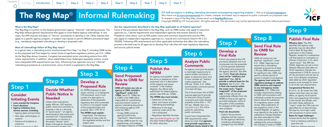 在《联邦公报》上发布拟议规则→征求公众意见→收集公众反馈并做出适当的修改→在《联邦公报》上发布最终规则,并规定规则生效和执行的具体日期。在发布最终规则时,机构必须说明并回收到的公众意见→新规实施后,可能面临诉讼,被法官叫停。