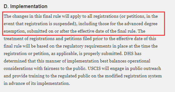 联邦公告称,在生效日后提交的申请将按照新规执行。