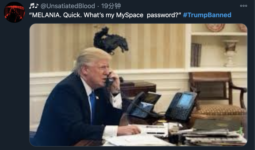 另外也有网友表示,不到最后一刻绝不放手的特朗普现在一定正给老婆打电话:“梅拉尼娅,我还有个叫My Space的账户,密码多少来着?”⬆️