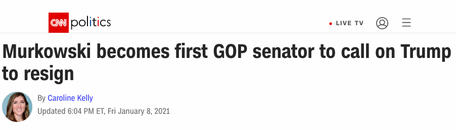 无独有偶,据CNN报道,另一位共和党参议院议员丽莎·默科夫斯基(Lisa Murkowski)更明确了当地表示,希望特朗普辞职。她成为了首位公开声明要特朗普提前离职的共和党参议院议员。