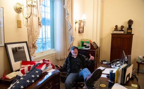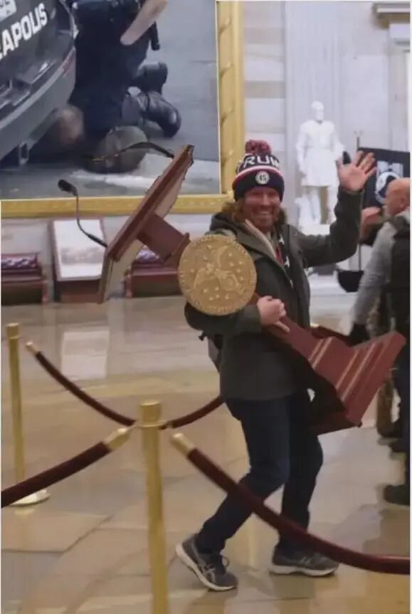 大家还记得,那个在暴乱中拿走了美国众议院议长南希·佩洛西(Nancy Pelosi)的讲话台的男人吗?