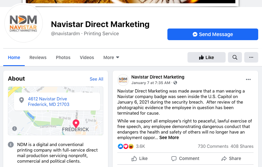 而这家位于马里兰州的印刷公司Navistar Direct Marketing于1月7日宣布,在接到该男子参与了骚乱中的消息后,已解雇了该名男子。