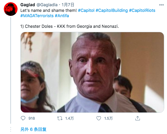 而一些社交媒体用户则开始疯狂地从FBI的照片中,人肉那些照片中有身份证的人。推特上甚至出现了这样专门人肉骚乱者的热门帖子: