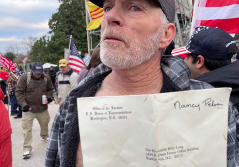 在1月6日的国会骚乱期间,巴内特进入美国众议院议长南希·佩洛西的办公室,拿走了一张印有佩洛西信笺抬头的信封。