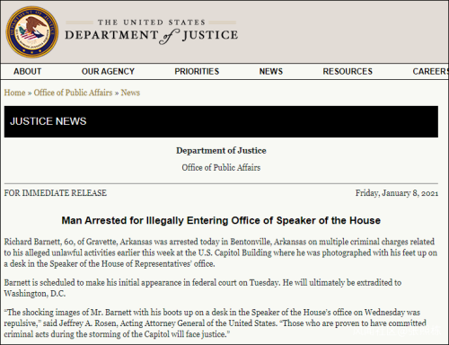 代理检察长杰弗里·罗森(Jeffrey Rosen)在1月8日的声明中说:“巴内特先生坐在众议院发言人办公室,并且把脚放在办公桌上的照片令人震惊和反感。被证明在国会大厦骚乱期间有过犯罪行为的人将面临司法制裁。”