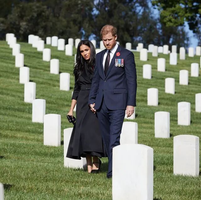 最近,他们在自己创办的一个名叫Archewell的公益网站上,他们发了张照片:在阵亡将士纪念日的那天,哈里和梅根手牵手在美国洛杉矶国家公墓出席了致敬死难军人的仪式。