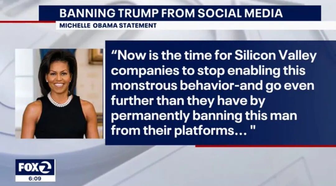 随后米歇尔奥巴马继续喊话:到时候了!所有硅谷的公司都应该封了特朗普!