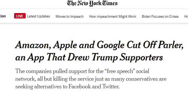 封号其实还是小意思,惹急了直接把服务器都给你撤了。比如一直以“言论自由”著称的Parler,一直是美国极端分子和暴乱分子的大本营,多次用于策划和组织暴力行动。在过去的几个月中,Parler已成为美国增长最快的应用程序之一,数以百万计的特朗普支持者蜂拥而至。拿它怎么办?很简单,Google和Apple在应用商店把它下架了,Amazon直接停止了Parler的网络云托管服务,看你没有服务器还怎么折腾。。见识一下什么叫走投无路。。