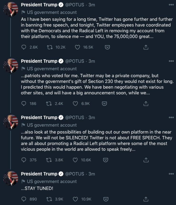特朗普说Twitter没有言论自由, Twitter与民主党和激进左派份子一伙的,删了我的账号,不让我和我的7500万粉丝发表言论!他还说我马上会有个重大的公告,我的团队在各地协商谈判,我们将会建立属于我们自己的新言论平台。我们不会继续沉默!最后一句话是,大家敬请期待!