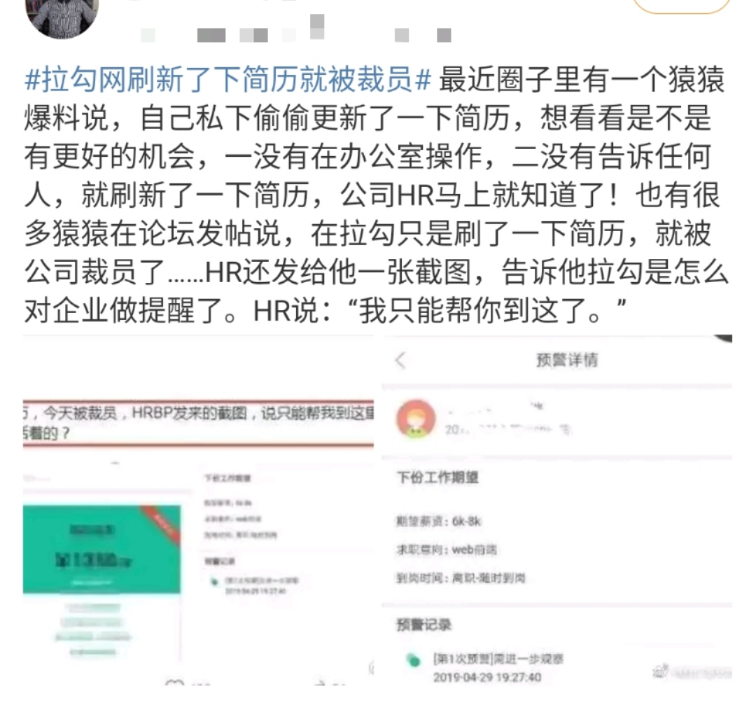 此前,求职平台拉勾网曾被爆料“员工刷新简历后被公司裁员”。