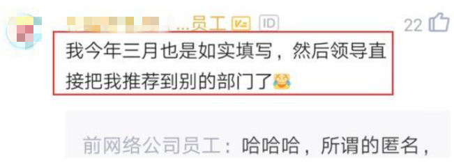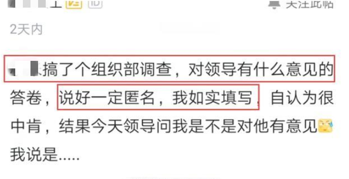 此前,某互联网公司员工发匿名帖,称公司搞了个对领导提意见的匿名调查,结果被领导锁定。
