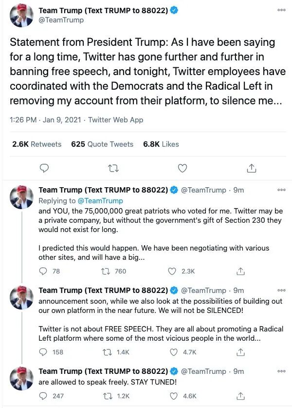 经历一系列换马甲风波,目前除了Twitter外,美国各大社交平台也相继封禁了特朗普的账号。
