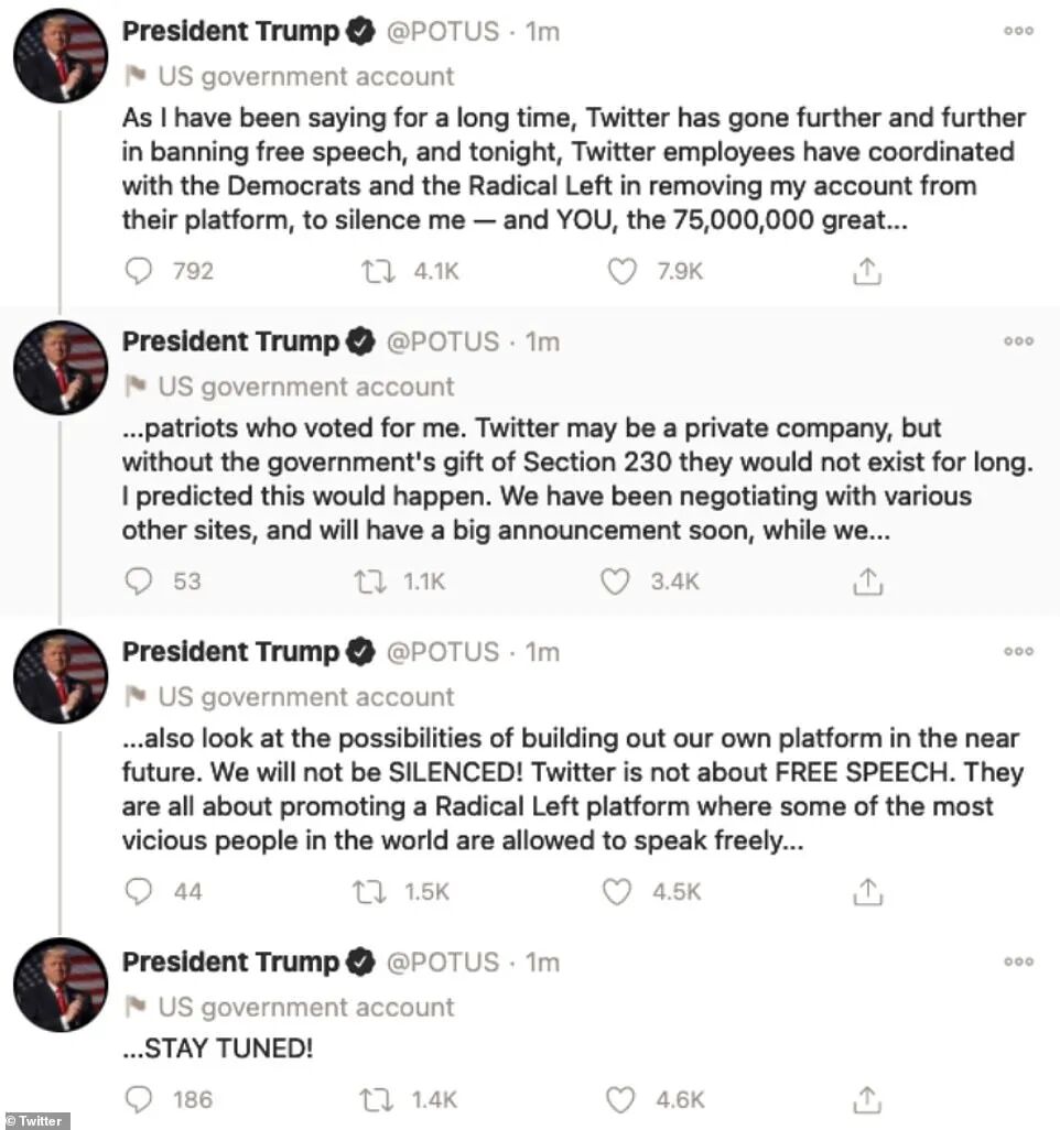 但这四条推文没有存活多长时间,很快就被推特删除殆尽。因为这个账号将于1月20日起为拜登所用,所以躲过一劫没有被封禁。