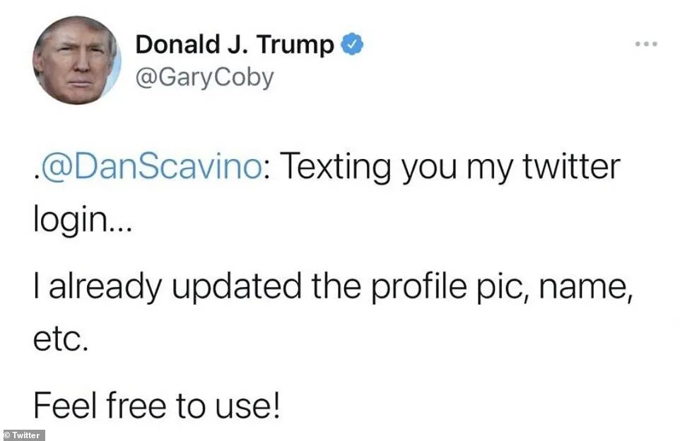 “@DanScavino 给你发了我的Twitter登录信息……我已经更新了头像、姓名等信息。请随意使用!”