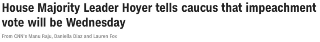众议院多数党领袖斯特尼·霍耶(Steny Hoyer)在电话中宣布,众议院将于1月13上午9点开会,就弹劾特朗普的议案进行投票。1月12日晚,众议院则将对马里兰州民主党众议院议员Jamie Raskin提出的议案进行投票,该议案旨在通过第25修正案将特朗普赶出众议院。