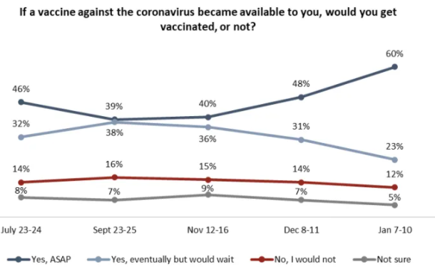 根据Angus Reid机构最新的民调显示,60%的加拿大人希望尽快接种疫苗,该比例比前几个月有所增加。