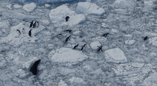 气候变暖,冰川融化,所以,鳞虾也在向更冷的冰层迁徙,自然地,企鹅保持同步。