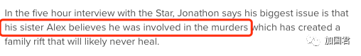 乔纳森在接受《星报》的五个小时采访中说,最大的问题是他姐姐亚历克斯(Alex)相信他参与了谋杀案,这造成了家庭裂痕,而且可能永远无法治愈。