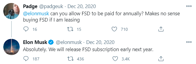 12月Elon Musk在Twitter上表示,2021年开始,特斯拉车主支付1万美金,就可以订阅自动驾驶FSD技术了。