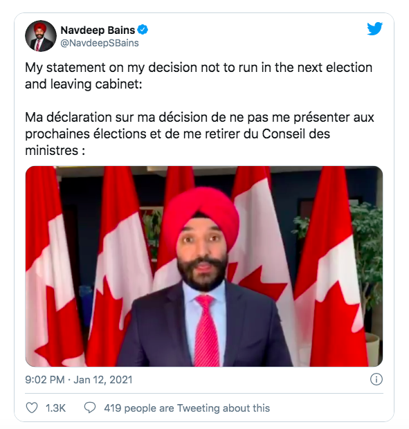 本次人事调整是由自由党议员纳夫迪普·贝恩斯(Navdeep Bains)引发的。贝恩斯宣布,为了有更多时间陪伴家人,他将不参加下次选举。