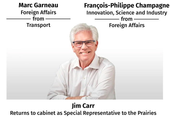 温尼伯国会议员吉姆·卡尔(Jim Carr)将重新担任内阁成员。他在2019年联邦竞选期间出现流感样症状后被诊断为多发性骨髓瘤,辞去了国际贸易多样化部长一职。今天,卡尔作为草原地区的特别代表重新加入内阁。