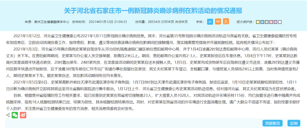1月12日晚间,贵州省卫健委通报河北省第35号新冠肺炎确诊病例史某某1月4日-1月5日曾在贵州境内活动,其中包括贵州茅台所在的遵义市: