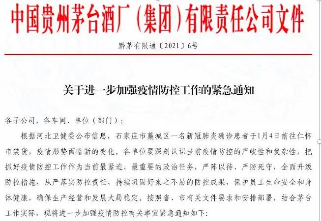 据中国基金报报道,受这一情况影响,贵州茅台今日发布《关于进一步加强疫情防控工作的紧急通知》(下简称“《通知》”)。