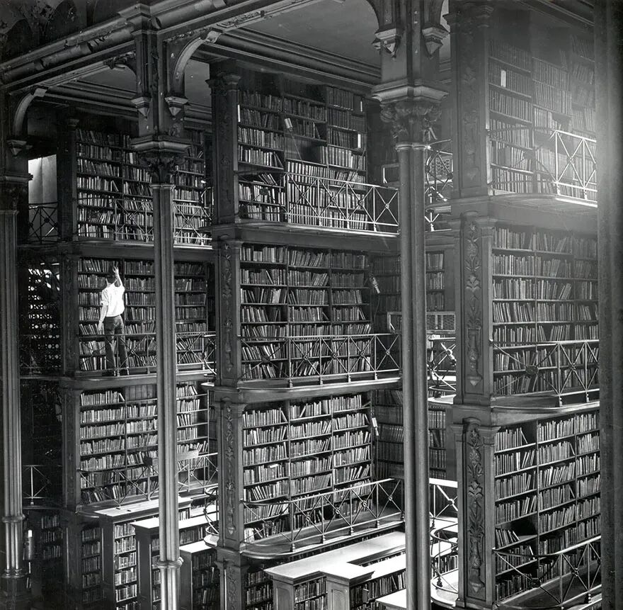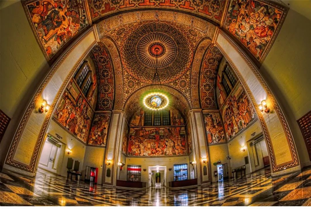 坐落在巴尔的摩约翰•霍普金斯大学,建于19世纪煤气照明和钢铁年代,图中的立柱、柱顶、露台、扶手和天花板都是铁铸的。